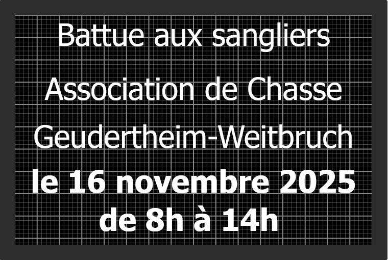 Une battue aux sangliers aura lieu dimanche 16 novembre 2025 de 8 h à 14 h. Cette battue se fera dans le lot 2 de la chasse de Weitbruch, et n'impactera Geudertheim qu'à la marge, sur le chemin longeant la décharge ultime de Weitbruch et le château d'eau de Geudertheim. Cliquez sur l'image ci-dssus.